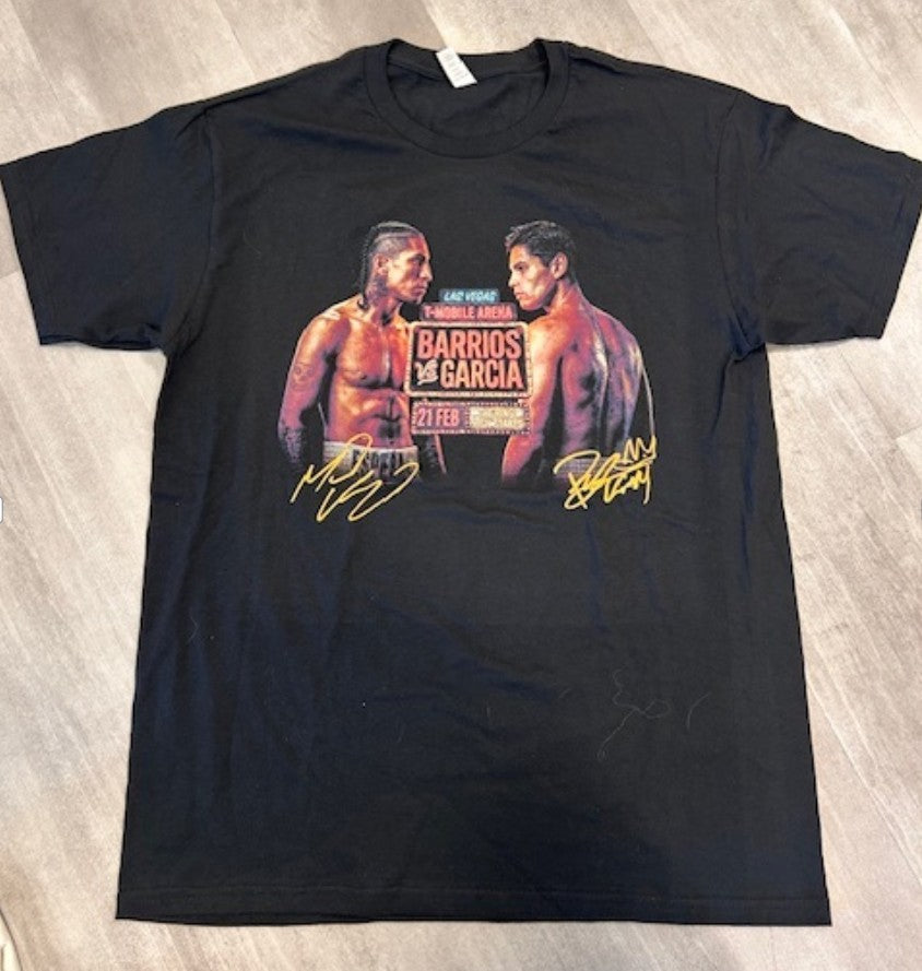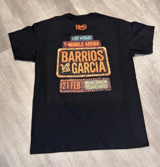 The only place to get this authentic, officially licensed t-shirt, commemorating the long-anticipated bout between Mario Barrios and Ryan Garcia on February 21, 2026 at T-Mobile Arena in Las Vegas. Get the authentic, officially licensed fight t-shirt with front and back graphics.