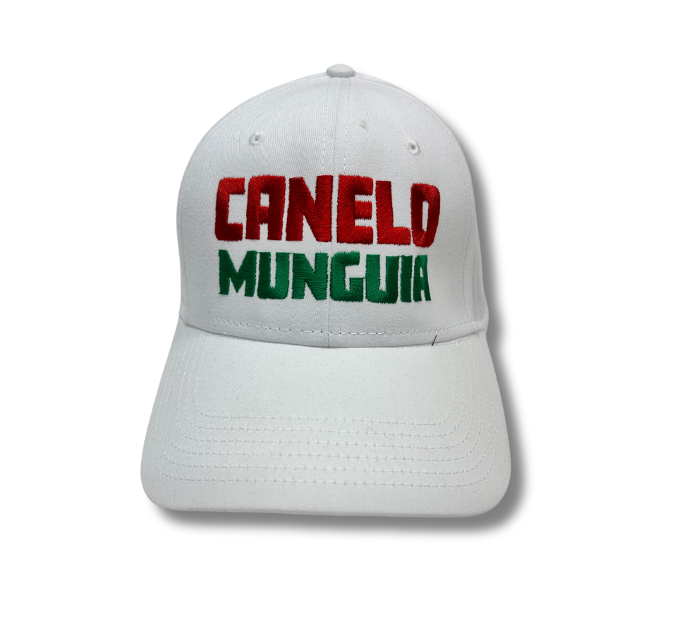 White Canelo vs Munguia hat with embroidered lettering in green and red. Side embellishment. Adjustable strap.