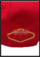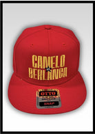 OFFICIAL Canelo vs Berlanga OTTO premium fabric, snapback, flat bill hat with red face and gold embroidery, embroidered side patch, side embellishments, classic fit, durable snap closure.