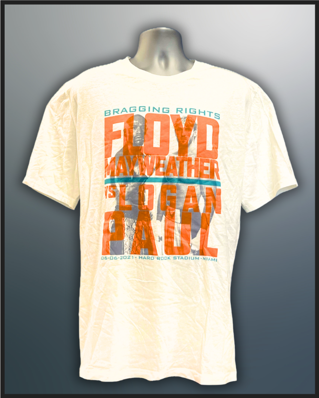 Official Floyd Mayweather Jr. vs Logal Paul, White with Gold and Teal, Bragging Rights Event T-Shirt